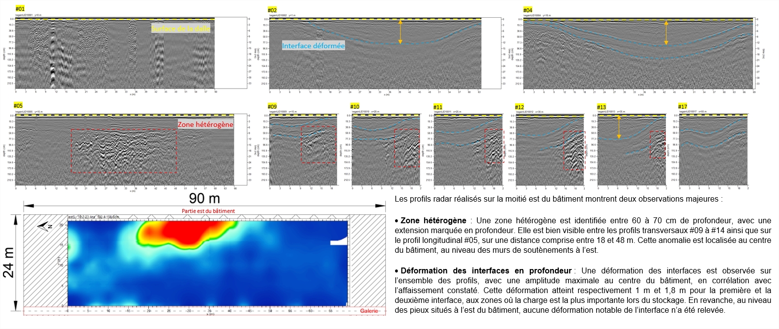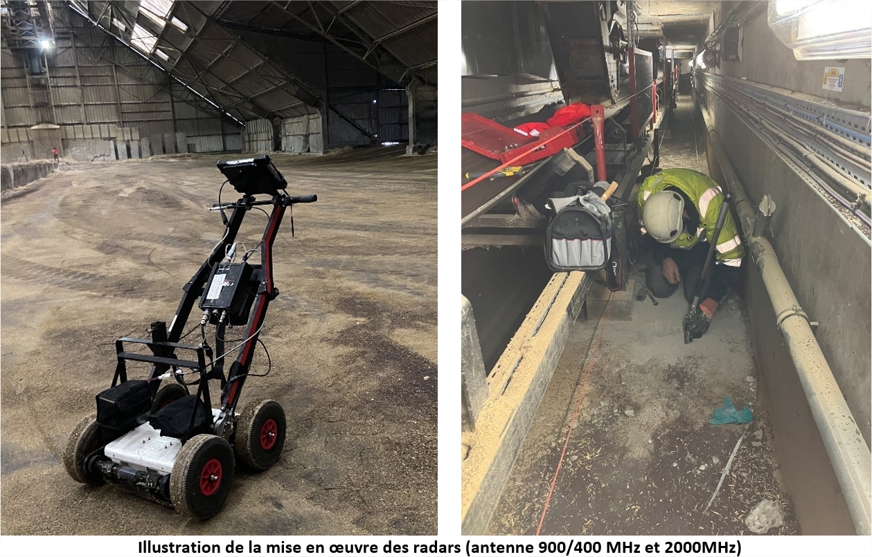 de diagnostiquer le dallage du bâtiment avec un radar bi-fréquentiel (400-900 MHz), afin de détecter d’éventuels désordres tels que des vides ou des terrains décomprimés.