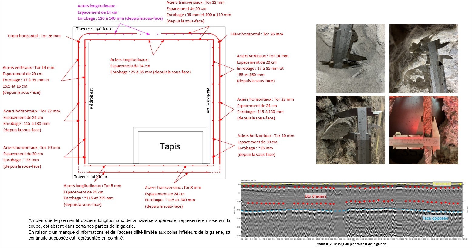 d’évaluer les caractéristiques constructives de la galerie en béton à l’aide d’un radar structure haute fréquence (2000 MHz)