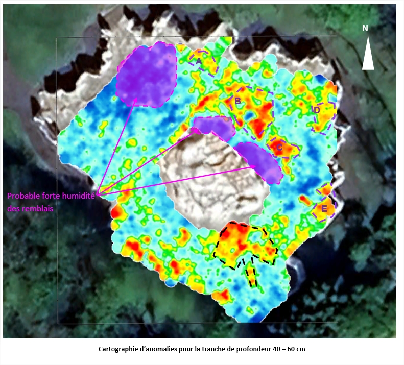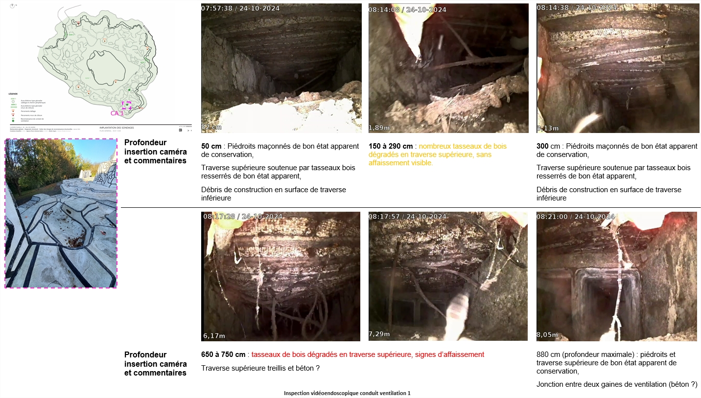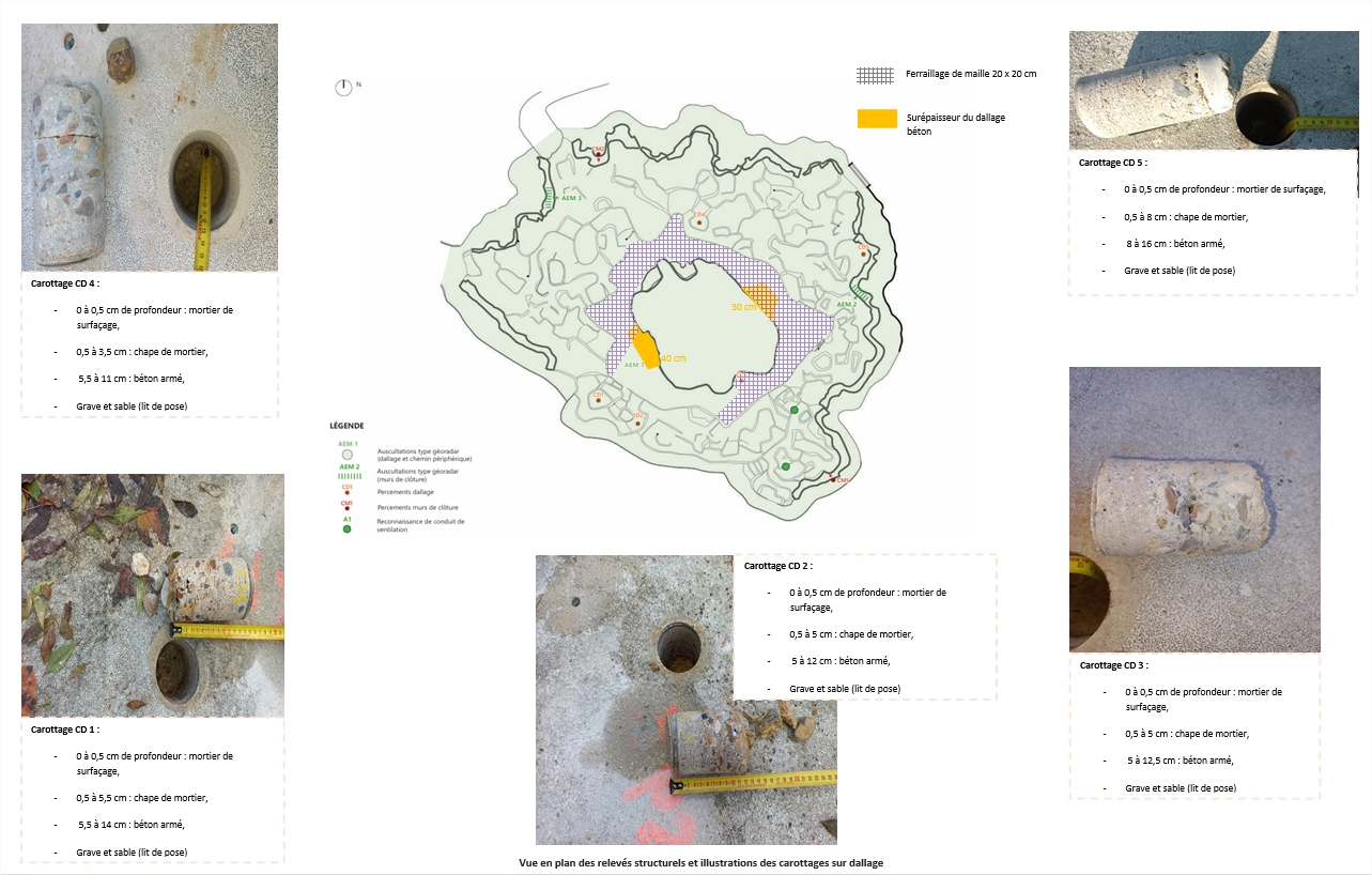 La campagne de mesures a pour objectif de déterminer les dispositions constructives et l’état sanitaire des édifices. Elle concerne le dallage ainsi que les terrains sous-jacents, les murs d’enceinte et les conduits de ventilation.